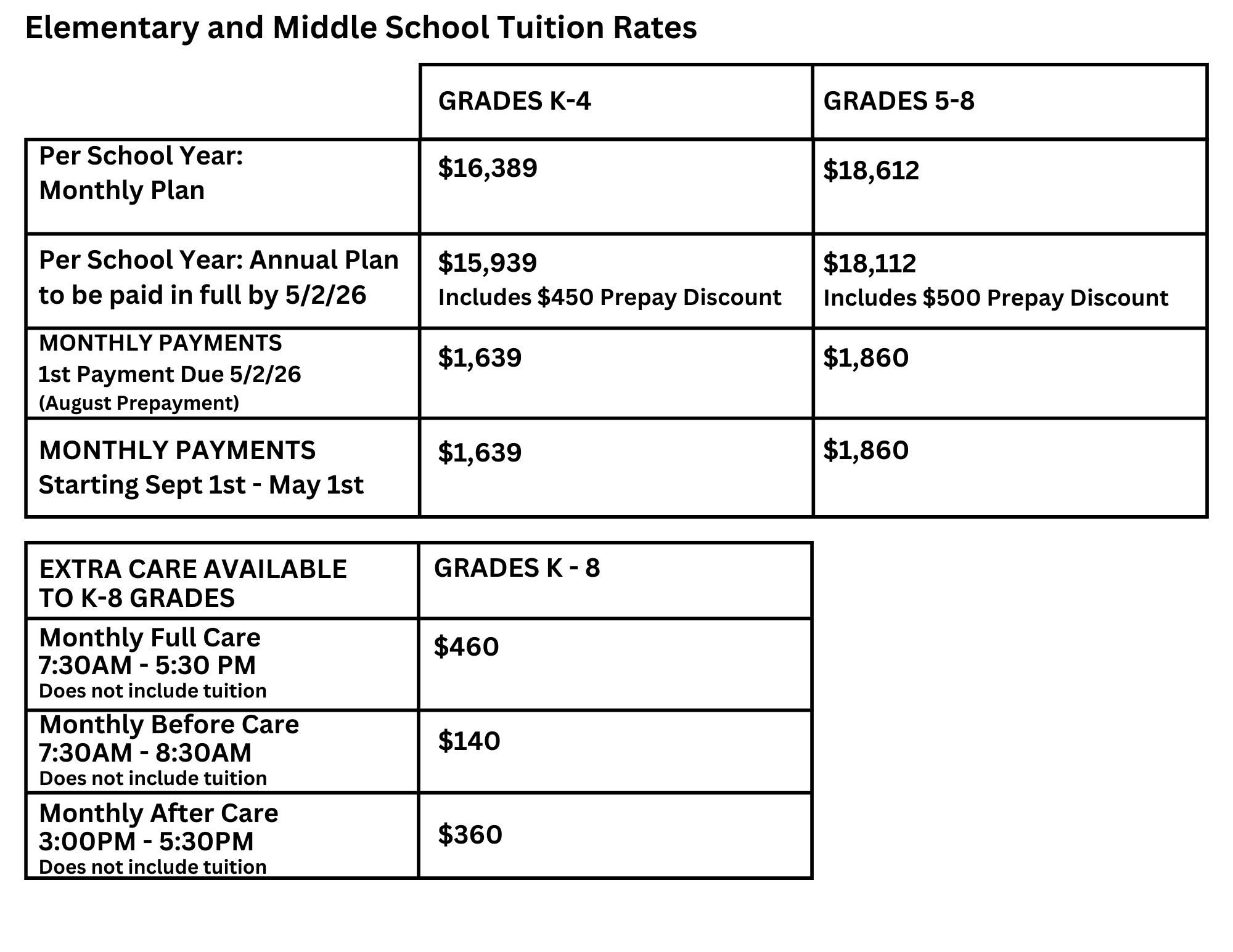 Elementary and Middle School Tuition Rates