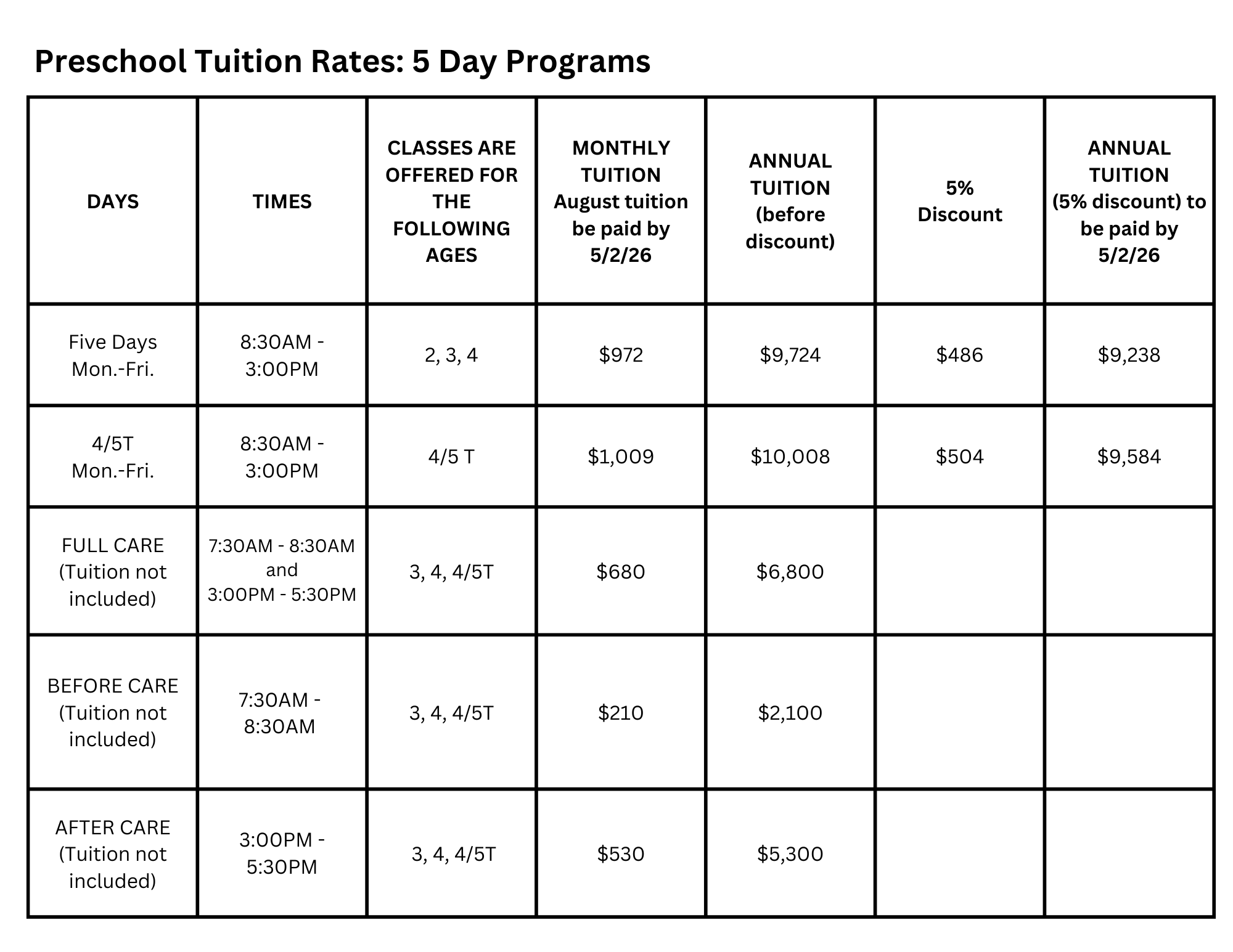 - The tuition amounts do not include a 5% sibling discount for Elementary and Middle.